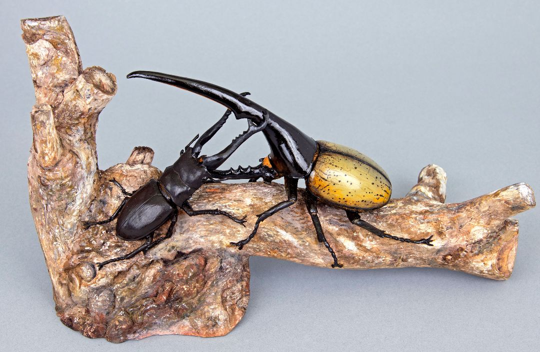 「木彫ヘラクレスオオカブトとギラファノコギリクワガタ」